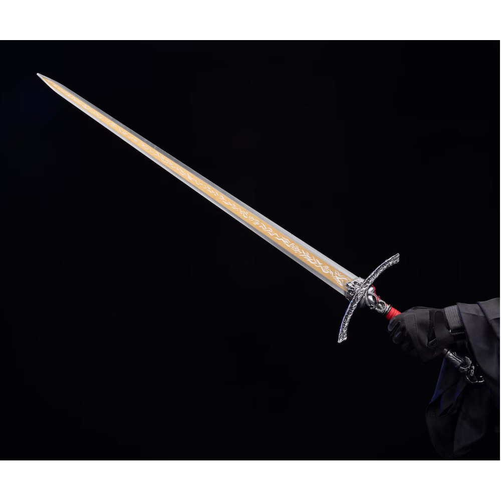 Das Design vereint verzauberte Klinge und ritterliche Form. Die rote Oberfläche, die gravierte Klinge und der detaillierte Kreuzschutz verleihen dem Schwert eine starke Ausstrahlung.