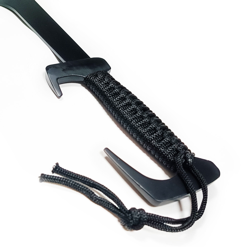 La poignée en acier recouvert de cuir.