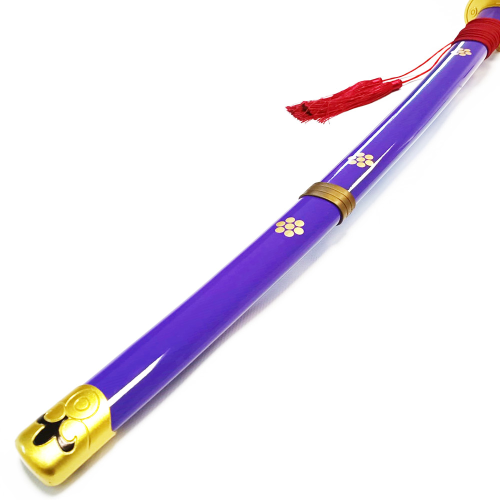 Le Saya est similaire à l'épée, avec des couleurs lilas et or assorties, et accentue l'aspect général de cette magnifique épée. Le fourreau est orné d'une fleur dorée à cinq pétales et d'un anneau de couleur bronze à mi-chemin du fourreau.