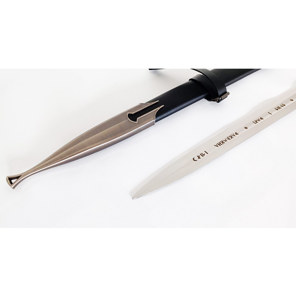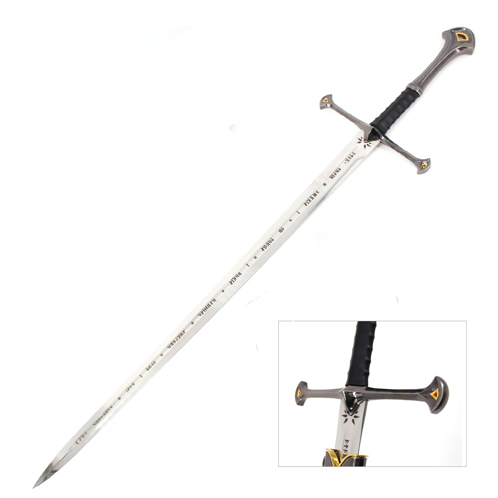 Cette impressionnante réplique d’Anduril mesure une longueur totale de 127 cm, avec une lame de 90 cm, en faisant une pièce authentique et imposante. La lame est fabriquée en acier inoxydable de haute qualité avec une épaisseur de 5 mm, offrant un ressenti solide et réaliste. Chaque détail, des inscriptions gravées à la garde élégante, a été reproduit avec soin pour donner vie à la magie de la Terre du Milieu.