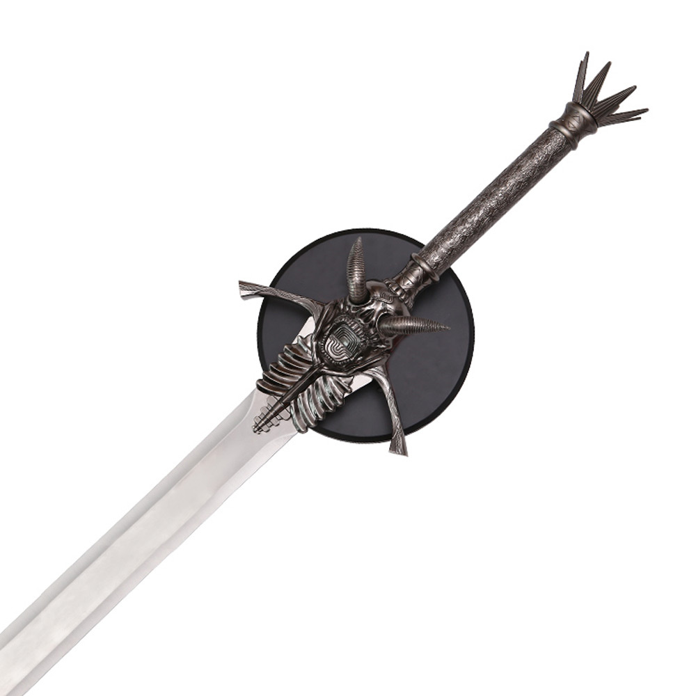 Rechtstreeks uit de blockbuster "Devil May Cry" video game serie, komt het dreigende "Demon Rebellion" zwaard tot leven met deze kolossale replica versie! Gedurfd benoemd en onberispelijk gemaakt, deze nauwgezette reproductie zwaard is een lust voor het oog. Niemand zal dit in het oog springende beest van een zwaard missen, vooral wanneer het wordt tentoongesteld met de meegeleverde houten display plaque. Bestaande uit een griezelige gehoornde schedel geflankeerd door dijbeenderen en felle ribbels, de gegoten metalen garde is bijzonder onheilspellend, zelfs ronduit griezelig. Een tirannieke gespijkerde kroon kolf bedekt het zwarte stalen handvat en geeft een passende donkere finishing touch aan dit duivelse zwaard.