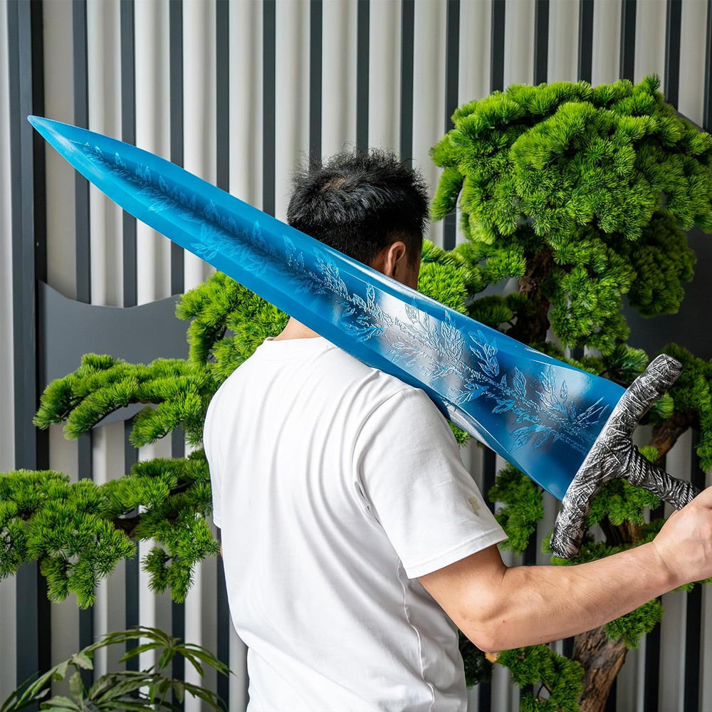 Vakkundig vervaardigd, heeft deze replica een totale lengte van 122 cm en een bladlengte van 89 cm, waardoor het een indrukwekkend authentiek stuk is. Het roestvrijstalen blad met een hoogtemperatuur blauwe afwerking weerspiegelt de etherische gloed van het originele wapen. De handgreep en beschermer meten 32 cm en met een gewicht van 3,65 kg voelt het aan als een echt legendarisch wapen in je handen.